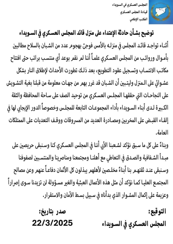 وكان مسلحون شنوا هجوما على منزل متزعم "مجلس السويداء العسكري" طارق الشوفي، على خلفية تأخر صرف الرواتب.