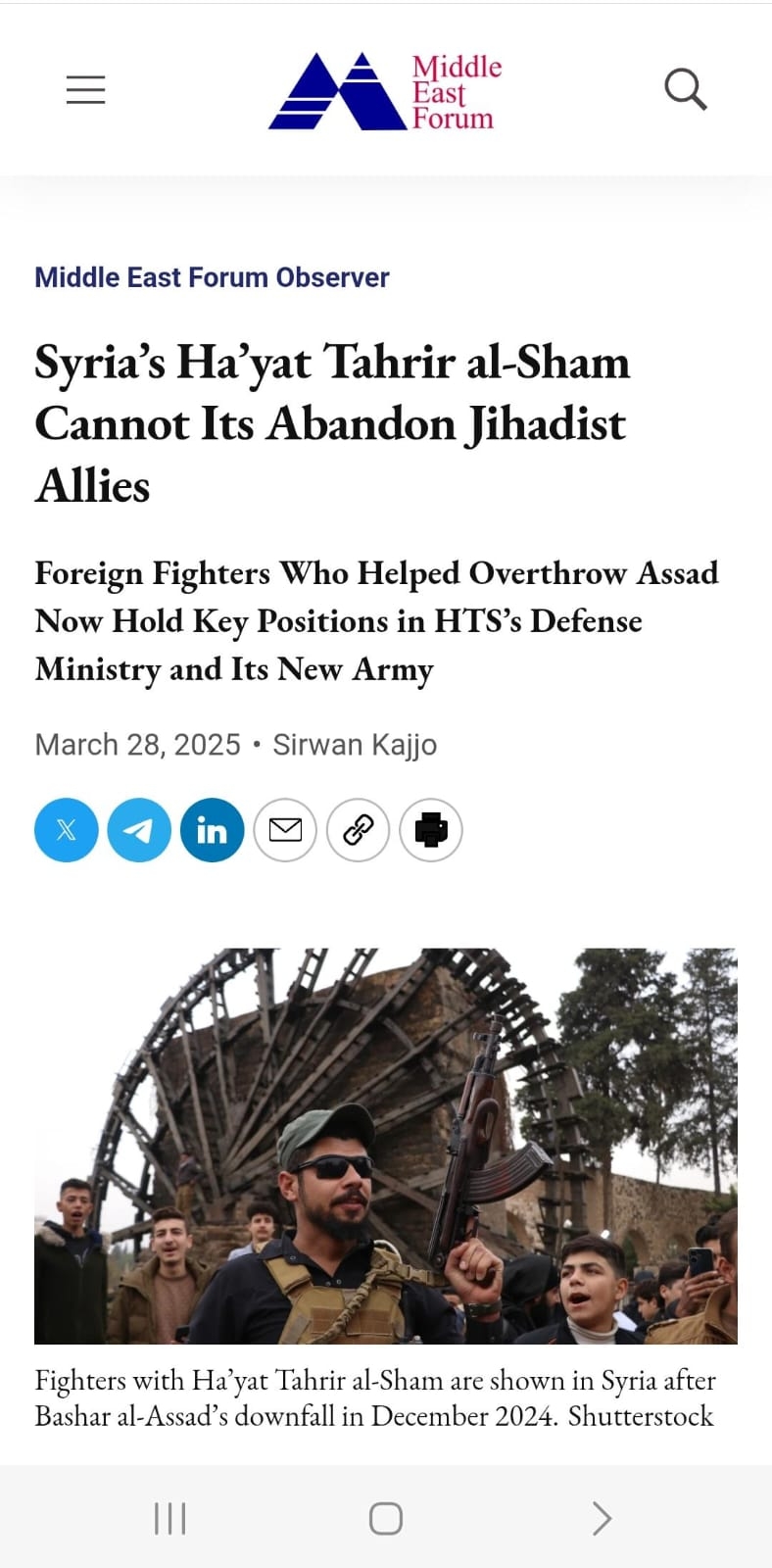 صحيفة " ميدل إيست فورم" سلطت الضوء على الموضوع وقالت إنه منذ سقوط نظام بشار الأسد في ديسمبر 2024، تسعى الحكومة السورية المؤقتة إلى ترسيخ سلطتها، لكن العقبة الكبرى تكمن في شبكة التحالفات الجهادية التي أوصلت هيئة تحرير الشام إلى الحكم.