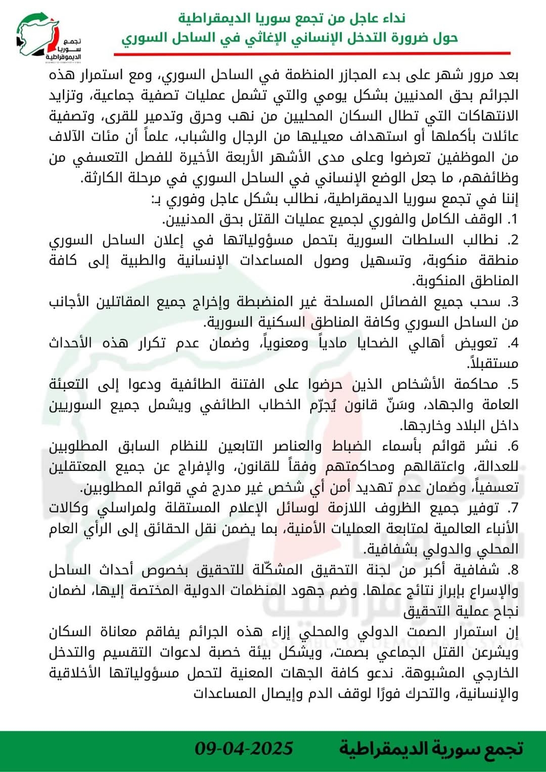 وطالب التجمع، في بيانٍ عاجل، المجتمع الدولي والسلطات السورية بالتحرك الفوري لوقف نزيف الدماء، مُوضحاً أن استمرار الصمت يُعمّق المأساة ويفتح الباب أمام تدخلات خارجية مشبوهة. وجاءت مطالب التجمع مُركّزة على عدة محاور، أبرزها: وقف كافة أشكال العنف ضد المدنيين، وإعلان الساحل السوري منطقة منكوبة لتسهيل وصول المساعدات الإنسانية، وسحب الفصائل المسلحة غير المنضبطة والمقاتلين الأجانب من المناطق السكنية.