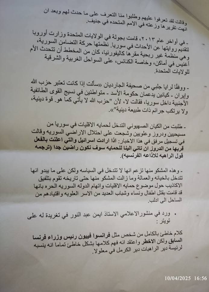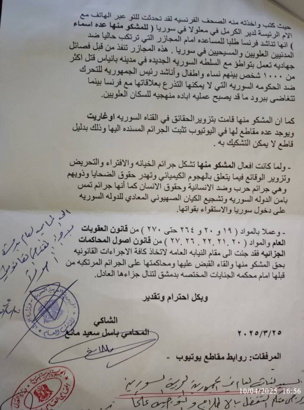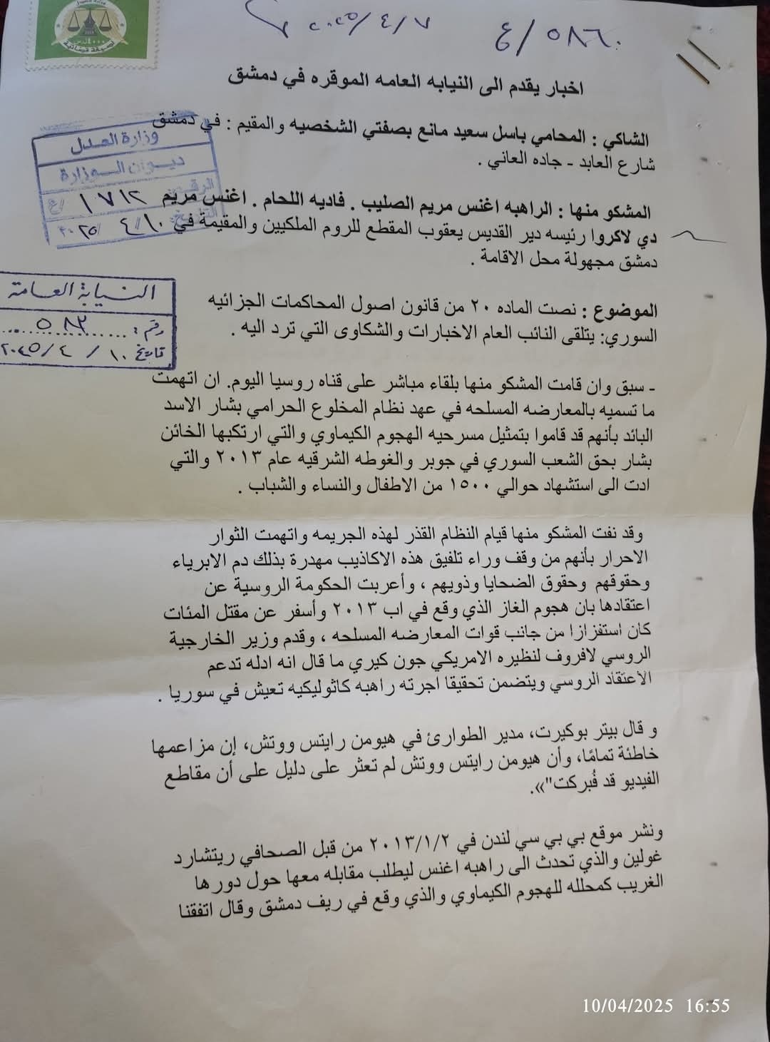 أكدت مصادر حقوقية أن النائب العام السوري وجه تعليماتٍ للمحامي العام الأول في دمشق بتحريك دعوى قضائية ضد الراهبة أغنيس مريم، بناءً على اتهاماتٍ لم تُثبت صحتها حتى الآن.