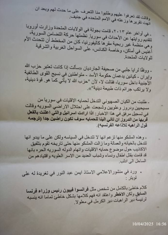يذكر أن الراهبة أغنيس مريم كانت قد تحدثت في مقابلة صحفية أوائل آذار الماضي عن مخاوفها من تصاعد نفوذ الجماعات المتطرفة، وتحوّل سوريا إلى دولة دينية، خاصة في ظل الأحداث الدامية ذات الخلفية الطائفية التي شهدها الساحل السوري. كما هاجمت خلال حديثها "أبو محمد الجولاني"، زعيم هيئة تحرير الشام، وقالت: "حتى لو ارتدى ربطة عنق، يبقى رمزاً للتطرف، وجذوره لا تنفصل عن المشروع الخطير الذي تقوده الجماعة".