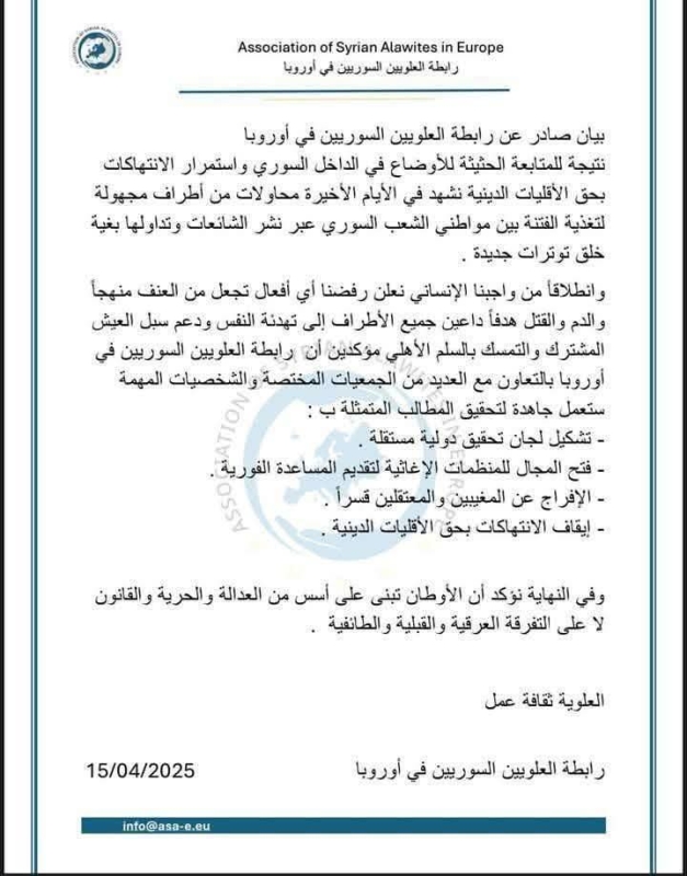 أكدت رابطة العلويين السوريين في أوروبا، في بيانٍ لها، أن الأوضاع في الداخل السوري تشهد تصعيداً خطيراً نتيجة محاولات أطراف مجهولة لنشر الشائعات وتغذية التوترات بين مكونات الشعب السوري، مشيرةً إلى أن هذه الممارسات تهدف إلى خلق فتنة جديدة واستهداف الأقليات الدينية.