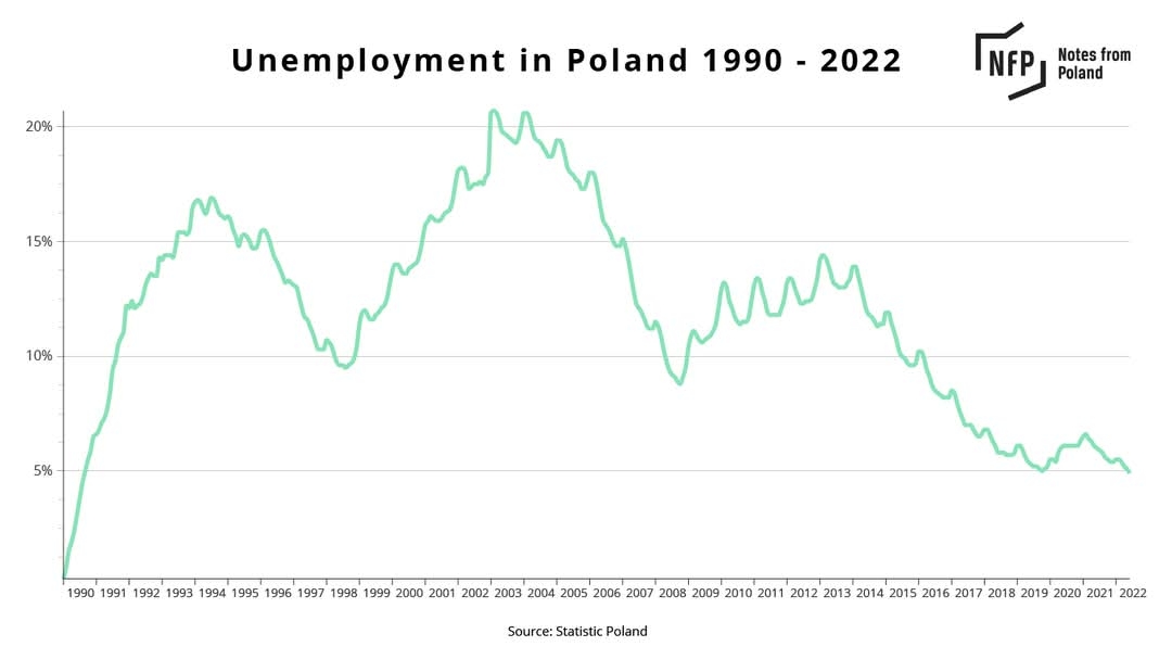 (الصورة المرفقة: رسم بياني يوضح ارتفاع نسبة البطالة في بولندا ووصولها إلى الذروة في عام 2000 قبل أن تعود للانخفاض إلى 5% مؤخرًا).