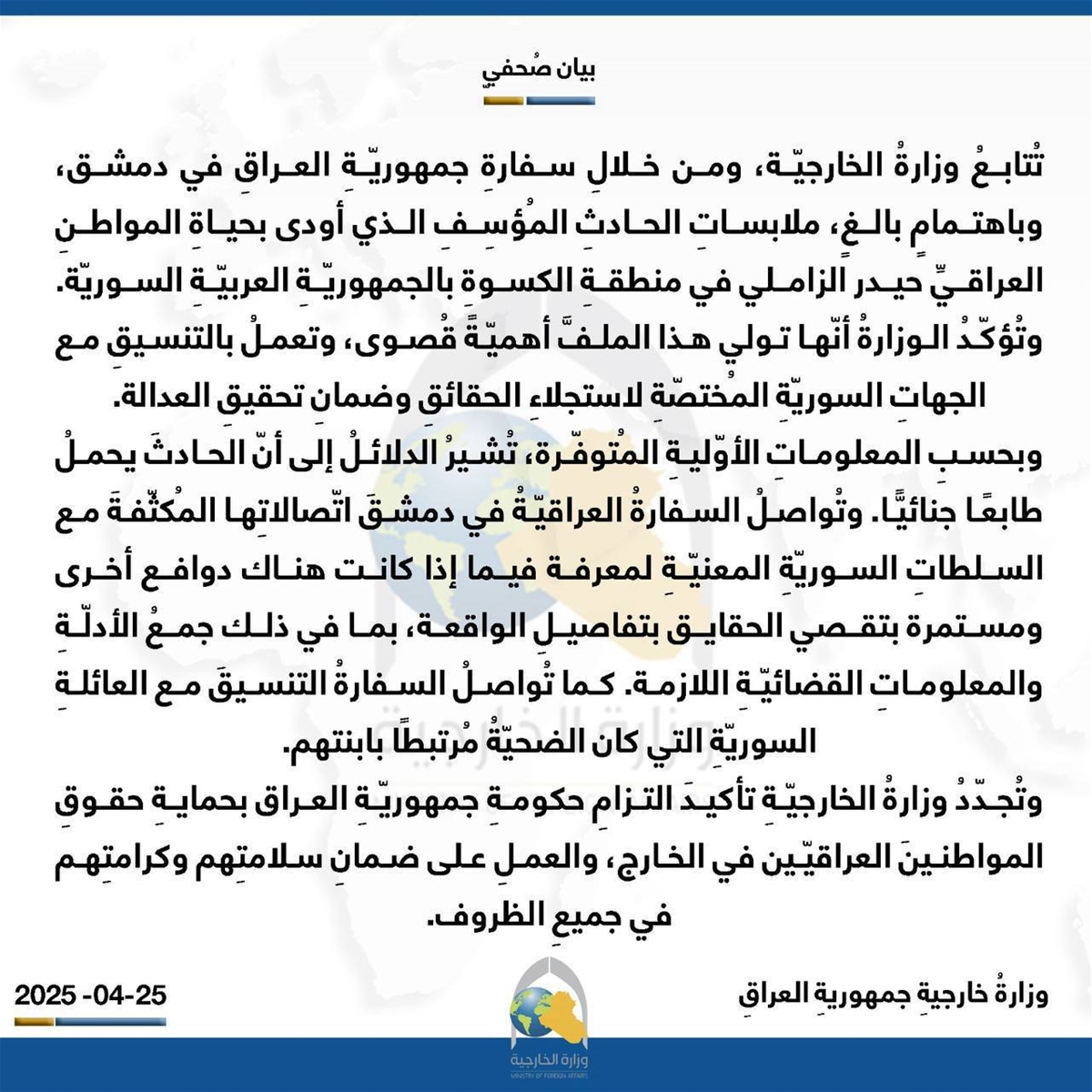 وبيّنت الخارجية العراقية أنها "تعمل على جمع الأدلة والتحقق من تفاصيل الواقعة، إلى جانب التواصل مع عائلة الضحية في محافظة بابل، والتنسيق مع العائلة السورية المرتبطة بالقضية".