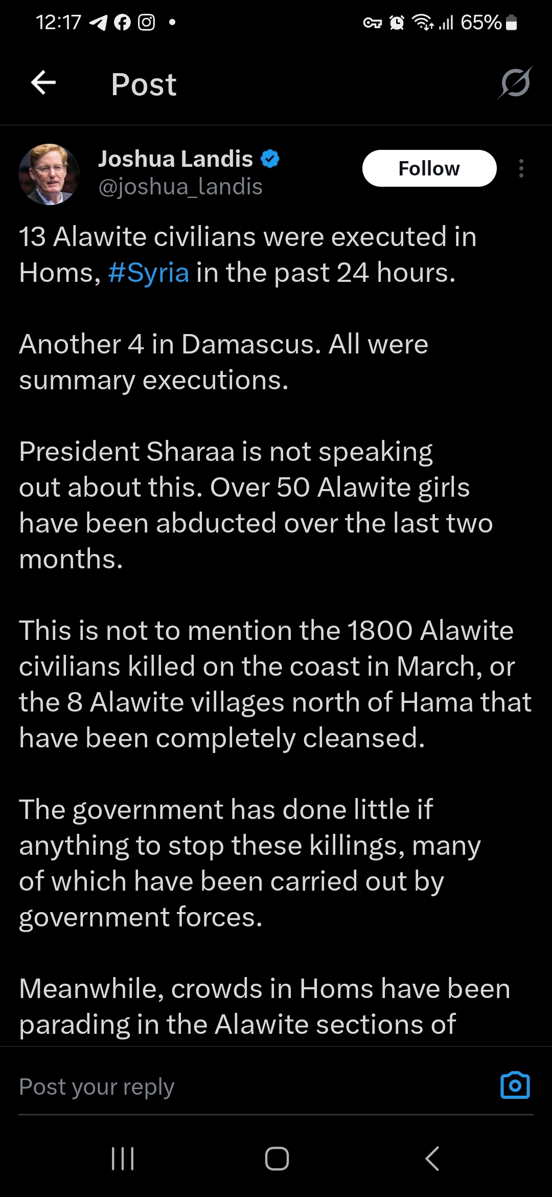 أكد الباحث الأمريكي الخبير بالشأن السوري ومدير مركز دراسات الشرق الأوسط في جامعة أوكلاهوما جوشوا لانديس إنه أُعدم 13 مدنيًا علويًا في حمص و4 آخرين في دمشق، خلال الـ 24 ساعة الماضية.