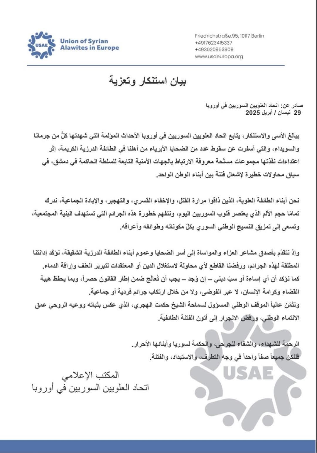 أعرب اتحاد العلويين السوريين في أوروبا عن استنكاره الشديد للاعتداءات الدامية التي شهدتها مدينتا جرمانا والسويداء، وأسفرت عن سقوط ضحايا أبرياء من أبناء الطائفة الدرزية.