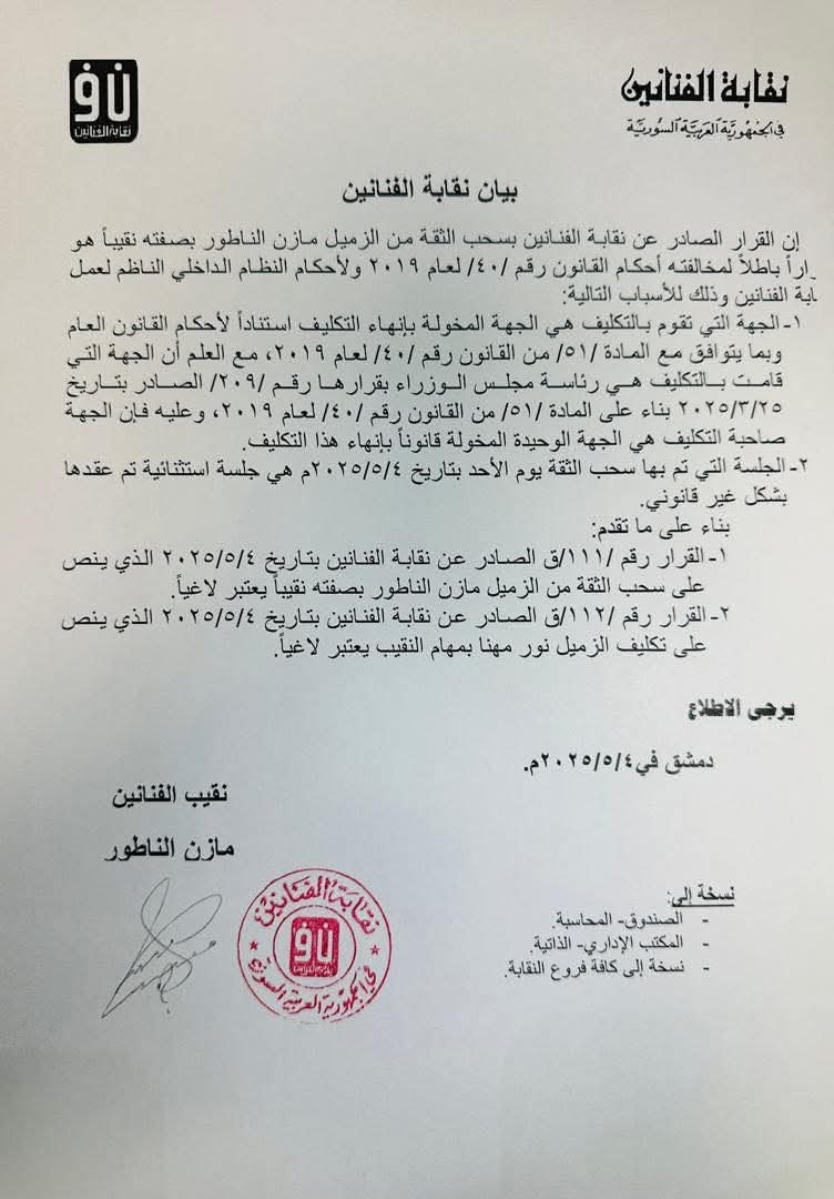 وفي وقت سابق، سحب أعضاء مجلس نقابة الفنانين السوريين، الثقة من نقيبها الفنان الممثل مازن الناطور بغالبية أصوات أعضاء المجلس.