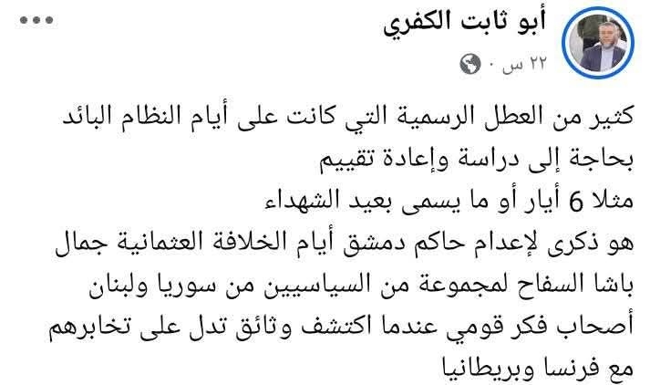 أكد المحلل السياسي مالك الحافظ أن دعوة مدير التربية في محافظة درعا محمد سليمان الكفري إلى "إعادة تقييم" بعض العطل الرسمية، ومنها عطلة السادس من أيار التي تُحيي ذكرى شهداء الاستقلال، تمثل انتهاكاً صارخاً للذاكرة الوطنية.