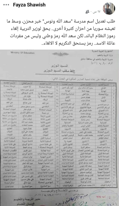 وجهت مديرية تربية دمشق طلباً رسمياً إلى وزارة التربية يطالب بتغيير أسماء عشرات المدارس في العاصمة السورية، ضمن حملة حكومية تشمل إزالة الرموز المرتبطة بالنظام السابق، حيث شمل القرار إعادة تسمية مدرسة الكاتب الراحل "سعد الله ونوس" إلى "السفيرة المهنية".