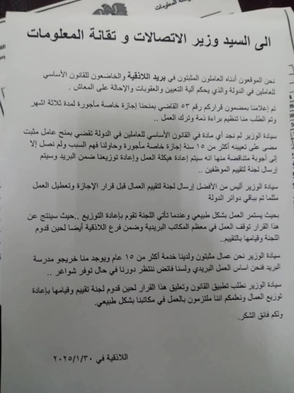 وجه موظفو بريد اللاذقية اليوم الأحد، مناشدة لوزارة الاتصالات وتقانة المعلومات بعد منح العشرات منهم أجازات مأجورة لمدة ثلاثة أشهر.
