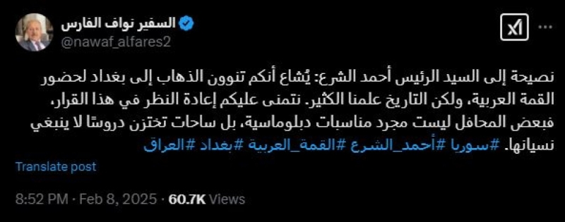 وقال الفارس في تدوينة تابعتها وكالة"نبض سوريا""، "نصيحة إلى الرئيس أحمد الشرع، يُشاع أنكم تنوون الذهاب إلى بغداد لحضور القمة العربية، ولكن التاريخ علمنا الكثير، نتمنى عليكم إعادة النظر في هذا القرار".