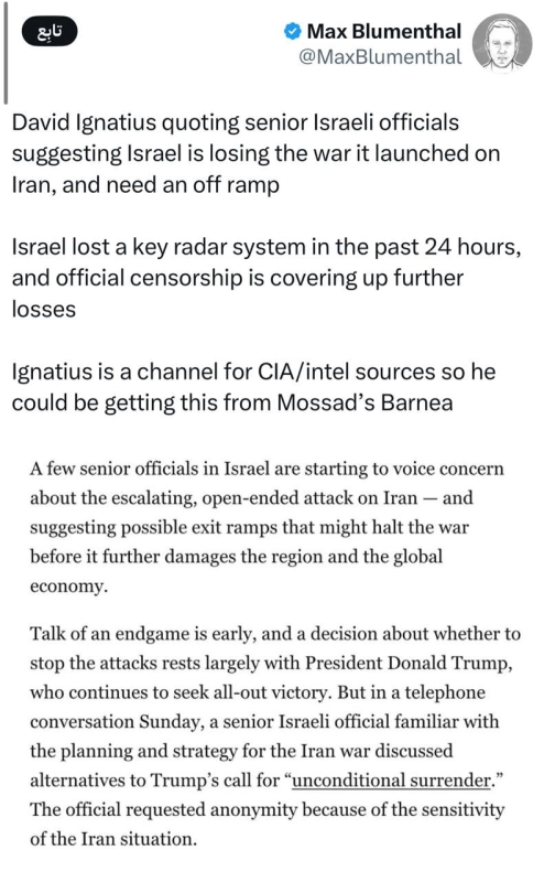 كشف الصحفي الاستقصائي الأمريكي ماكس بلومنتال، نقلاً عن الكاتب والمحلل المخضرم ديفيد إغناتيوس، المقرب من دوائر صنع القرار في الاستخبارات المركزية الأمريكية (CIA)، عن مؤشرات خطيرة تعكس تحولاً في الموقف الإسرائيلي إزاء التصعيد مع إيران.