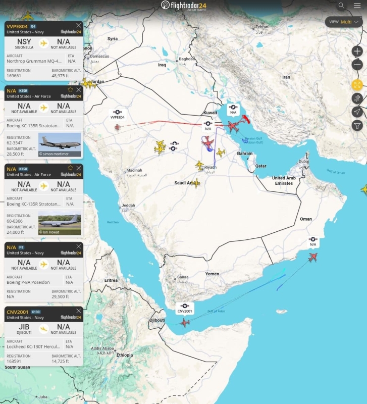 كشفت بيانات تتبع حركة الطيران عن تحركات جوية مكثفة للقوات الأمريكية في منطقة الخليج العربي وبحر العرب، شملت طائرات عسكرية متعددة المهام، في مؤشر على نشاط عملياتي واسع النطاق تشهده الأجواء الإقليمية.