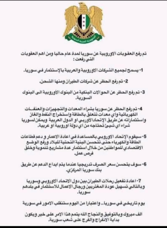 وقالت الوثيقة أن الاتحاد سيقيّم في الخطوة التالية إمكانية تعليق المزيد من التدابير التقييدية، وسيدرس استمرار تعليق العقوبات بناءً على مراقبته للأوضاع في “سوريا”.