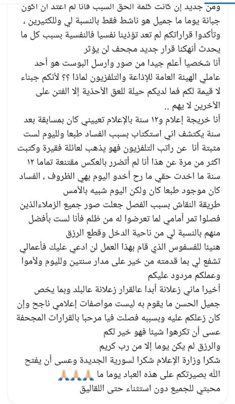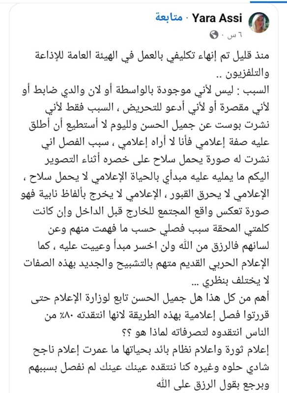 أقدمت وزراة الإعلام اليوم الخميس ،على فصل الصحفية يارا عاصي العاملة في الهيئة العامة للإذاعة والتلفزيون بسبب نقدها لإحدى الناشطين التابعين للشرع .