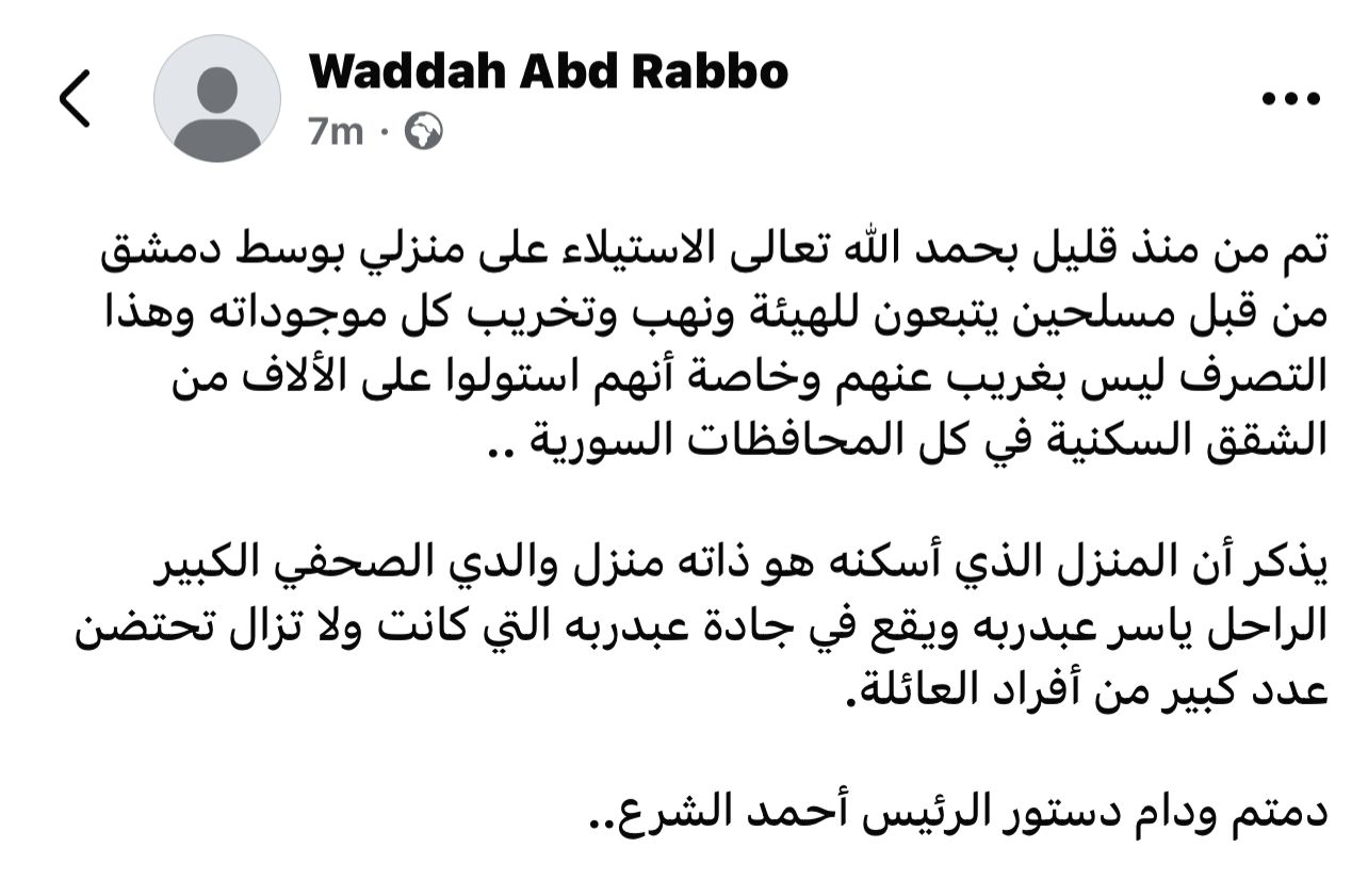 وفي منشور على صفحته في فيس بوك قال عبد ربه "إن مسلحين يتبعون لـ"الهيئة" قاموا منذ قليل بالاستيلاء على منزلي الكائن في وسط دمشق"، مشيرًا إلى أنهم نهبوا محتوياته وألحقوا أضرارًا كبيرة به.