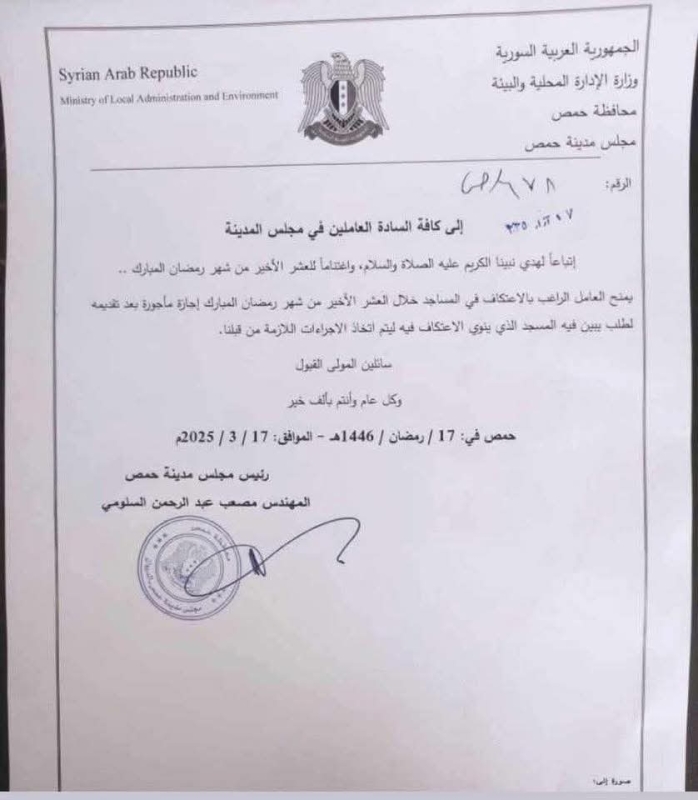 أعلن رئيس مجلس مدينة حمص المهندس مصعب عبد الرحمن السلومي ، منح العامل الراغب بالاعتكاف بالمسجد إجازة مأجورة.