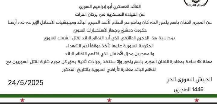 "بركان الفرات" تهدد الفنان باسم ياخور وتطالبه بمغادرة سوريا خلال 48 ساعة